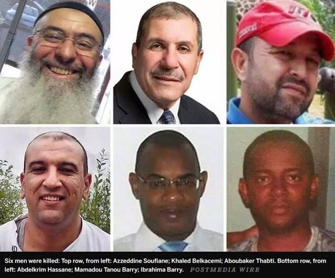 Ninkan ayaa qirtay in weerarkii masaajidka uu ku dilay Khaled Belkacemi oo ahaa 60 jir, Azzedine Soufiane oo ahaa 57 jir, Abdelkrim Hassane oo ahaa 41 jir, Mamadou Tanou Barry oo ahaa 42 jir, Aboubaker Thabti oo ahaa 44 jir, iyo Ibrahima Barry oo ahaa 39 jir, kuwaas oo ahaa dhamaantood dadkii ku cibaadeysanayey Masjidka.