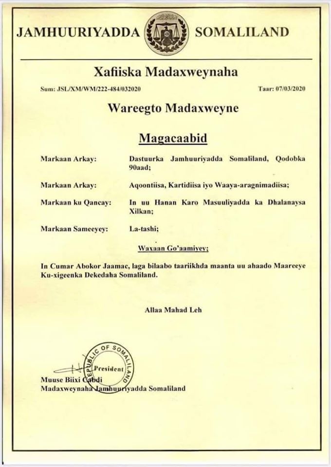 Halkan Hoose Ka Akhriso wareegtada Madaxweynuhu Xilka Kaga Qaaday Maareye kuxigeenka Hore ka Cusubna Ku Magacaabay