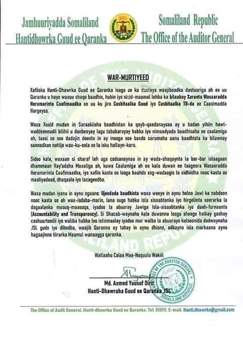 Hargeysa(Berberatoday.com)-Xafiiska Hantidhawraha guud ee Qaranka Somaliland oo baadhis ka bilaabaya wasaaradda caafimaadka iyo cisbitaalka Guud ee Magaalada Hargeysa, si looga hortago musuqmaasuqa.