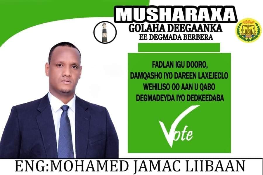 Sidaas darteed dadkaygii sharafta lahaayow anigoo ah Eng Maxamed Jaamac Liiban waxaan mar labaad idiin cadaynayaa inaan ahay Musharax u taagan doorashada gollaha deegaanka ee fooda inagu soo haysa, anoo haduu alle idmo wata afkaar, aqoon iyo waayo aragnimo aan kaga qayb qaadan doono idam alle hayaanka horumarineed ee Degmada Berbera ee soo socday in muda ahba.