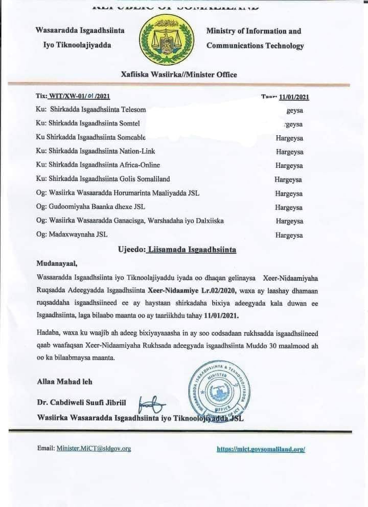 Wasiirka Wasaaradda Isgaadhsiinta iyo Tignoolajiyadda Somaliland Cabdiweli Suufi Jibriil, ayaa Warqad qoraal ah oo uu u kala diray Shirkadaha Isgaadhsiinta soo saaray, isla markaana ku amray Shirkadaha inay u hoggaansamaan Xeer-nidaamiyaha dhaqangalka ah ee dhawaan la sameeyey ee la xidhiidha Siyaasadda lagu hagayo Shirkadaha Isgaadhsiinta dalka.