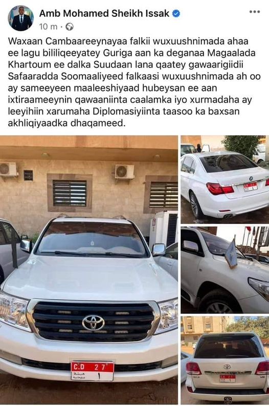 SUUDAAN: Guriga safiirka Soomaalida u fadhiya Khartuum ayaa la bililiqeystay, iyada oo lagala baxay Gaadiidkii ay lahayd Safaaraddu, sida u sheegay safiirka oo cambaareeyay ficiladan oo uu ku tilmaamay in ay ka baxsan tahay xeerarka caalamiga ah ee diblumaasiyadda.
