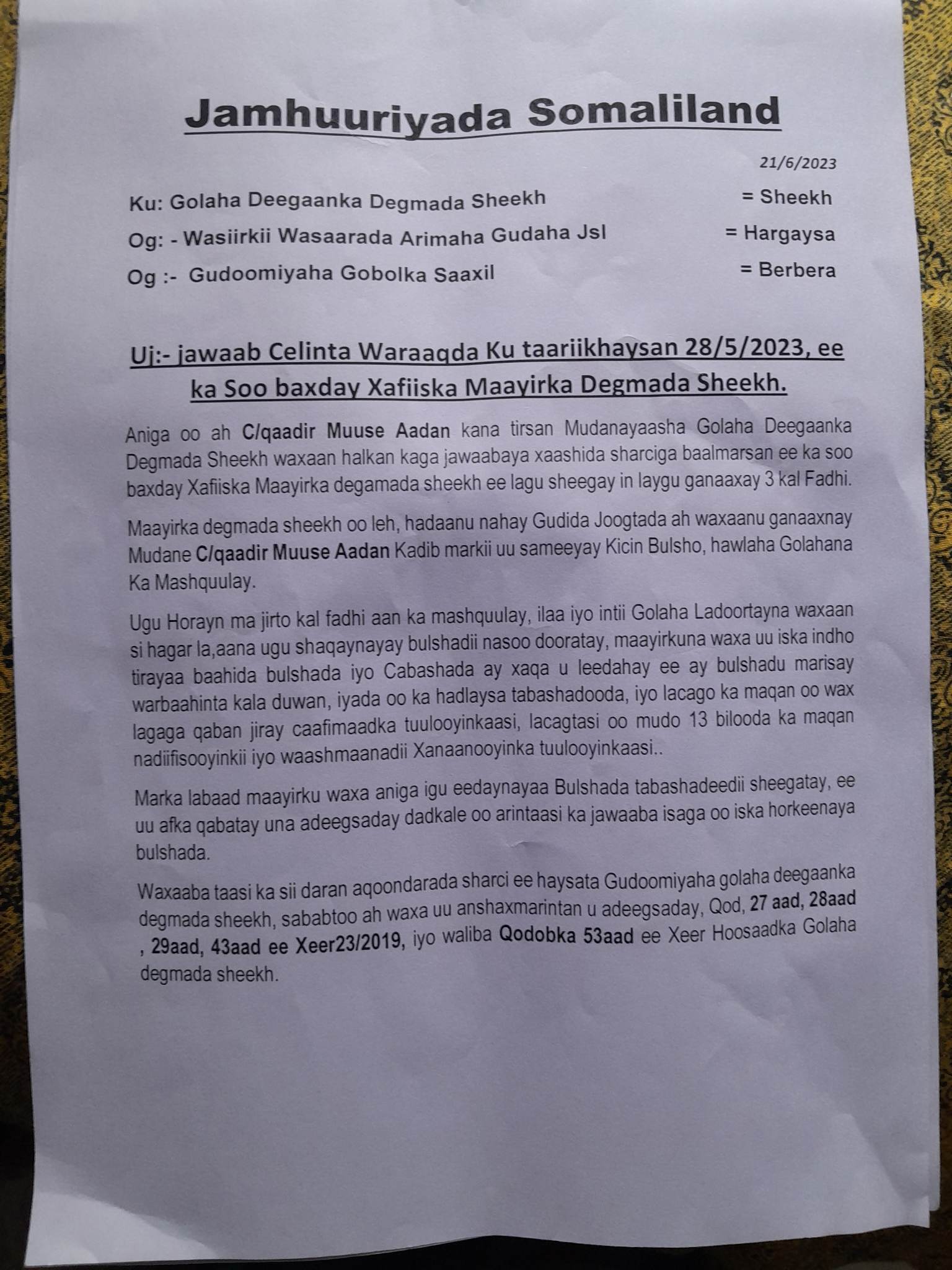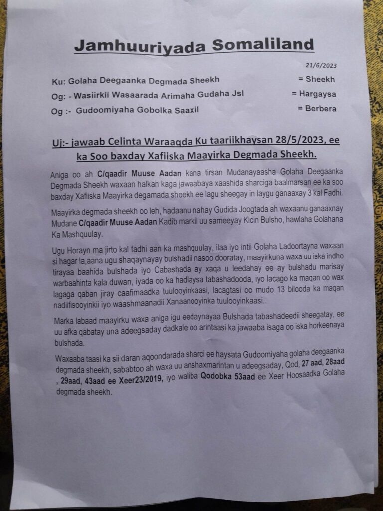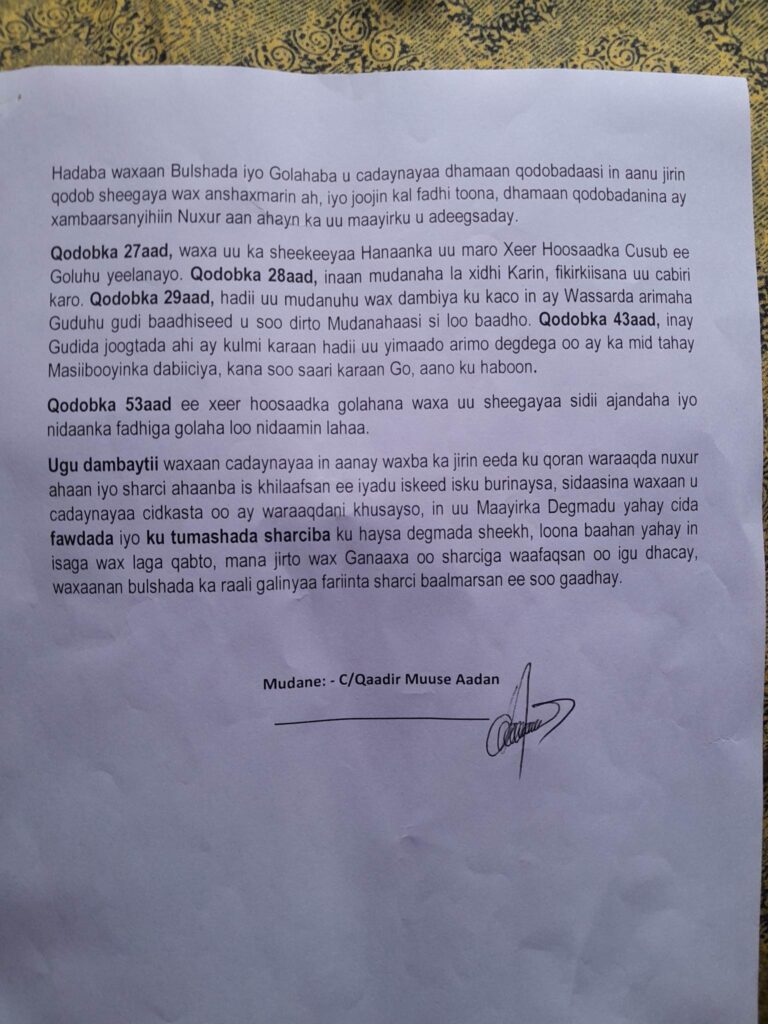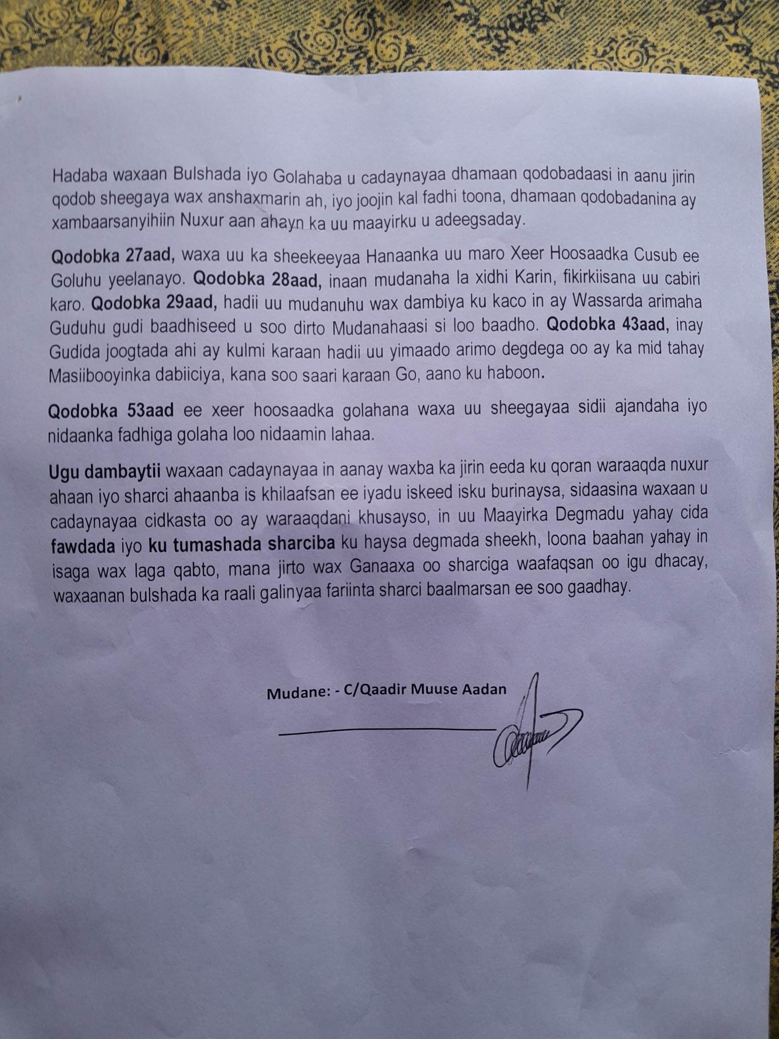 Cabdiqaadir Muuse oo Kamid Xubnaha Golaha Deegaanka Degmada Sheekh oo Qodobo Sharci Iskaga Difaacay Ganaax Mayarka Degmadiisu Duldhigay