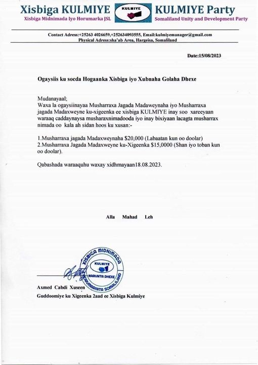 Xisbiga Kulmiye ee Somaliland oo Waraaq Kusoo Saaray Shuruudaha Laga Rabo Musharaxa Madaxweynaha Xisbiga Kulmiye Iyo Musharax Madaxweyne Kuxigeenka.