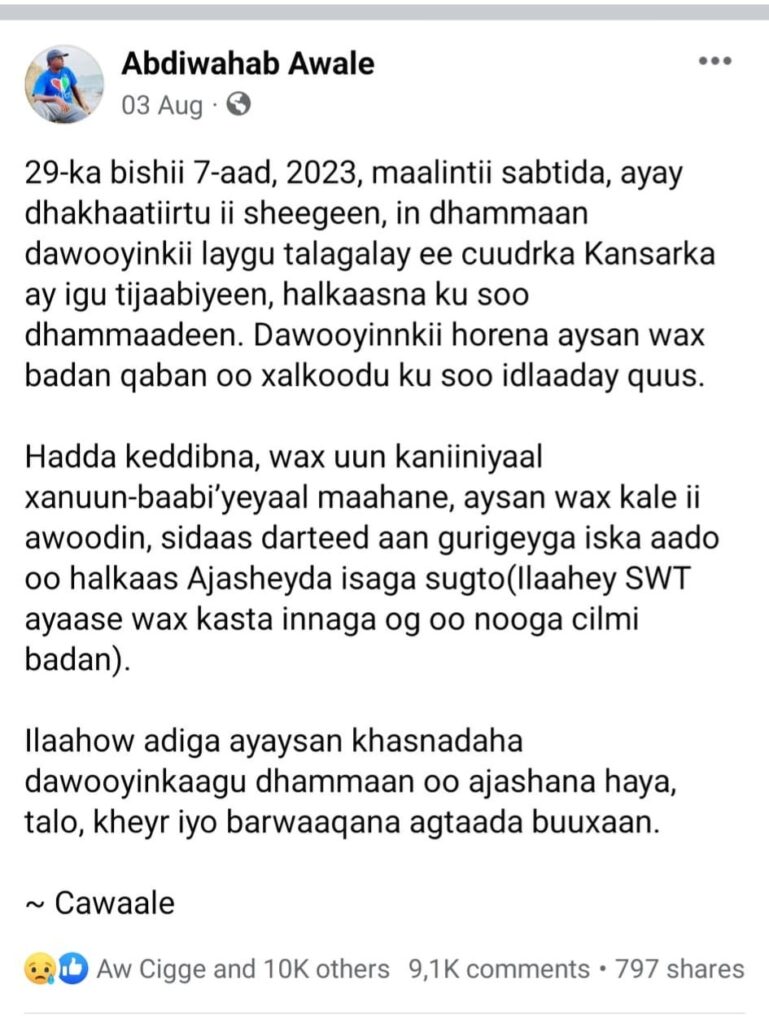 Alle Ha unaxariisto inbadan uu la tacaalayay Xanuunka Kansark Maanta ayay tiisii boqotay uu Geeriyooday Marxuum Cabdiwahaab Cawaale.