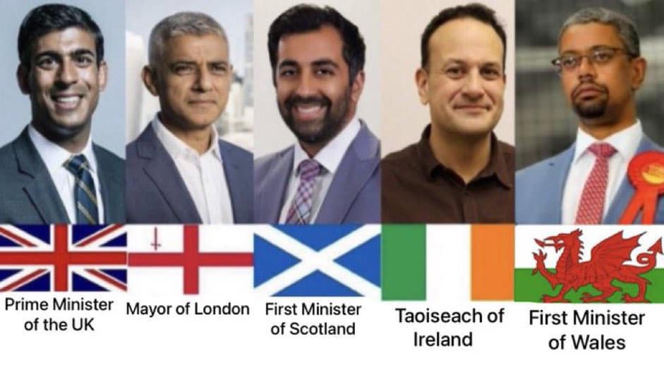 Ra’isal wasaaraha dalka ingiriisku waa Rishi Sunak waa nin asal ahaan Hindi ah, hogaamiyaha Scotland waa Xamse Yuusuf oo asalkiisu yahay Pakistani.