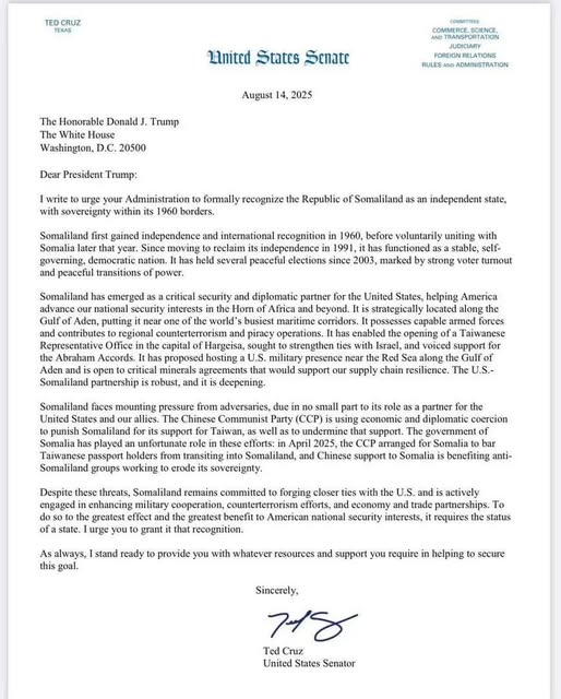 Senator-ka xisbiga jamhuuriga ka tirsan ee laga soo doorto gobolka Texas ee dalka Mareykanka, Ted Cruz , oo ah guddoomiyaha guddiga hoosaadka Senate-ka Mareykanka ee arrimaha Afrika ayaa si cad u faafiyay inuu u diiray Trump , warqad soo jeedin ah oo uu ku boorrinayo inuu aqoonsado Somaliland.