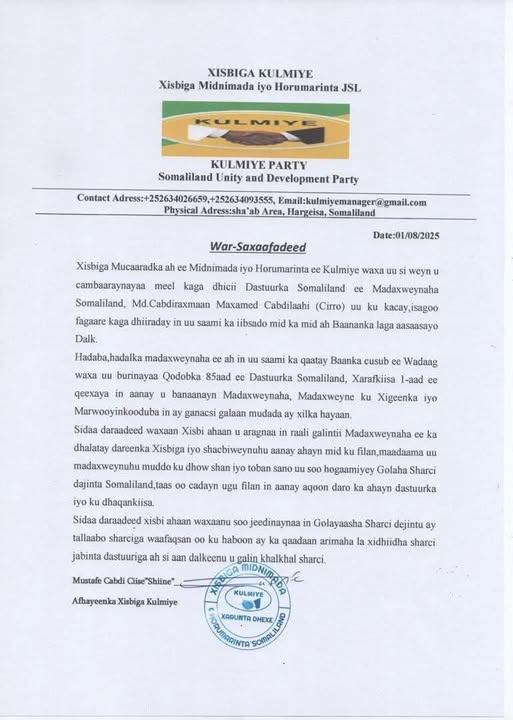 “Raaligelinta Madaweynuhu Kuma Filna Sharci-jabintii Dastuuriga Ahayd ee Uu Sameeyey Madaxweyne Cabdiraxmaan Ciro” – Warsaxaafadeed Xisbiga KULMIYE.