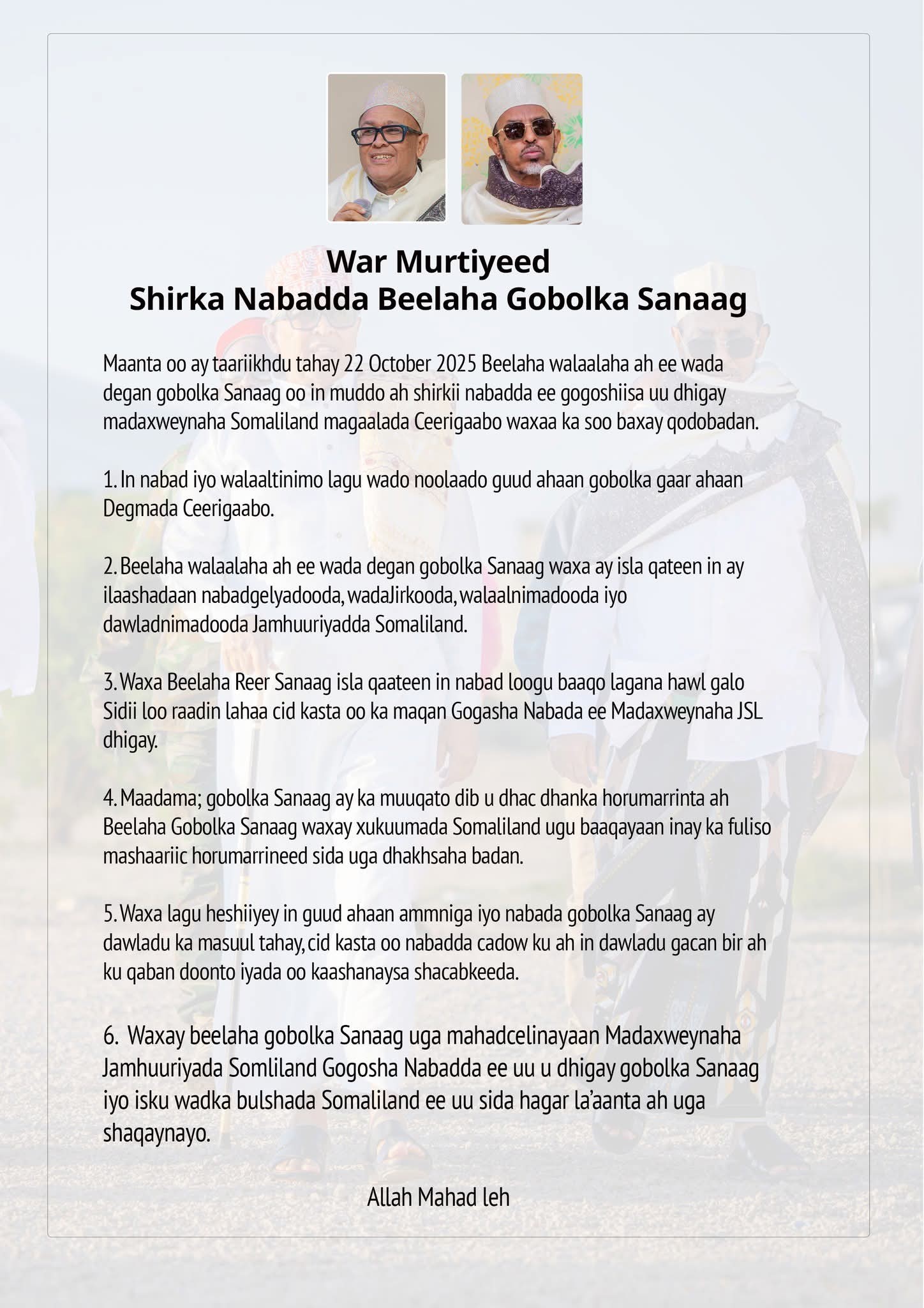 Maanta oo ay taariikhdu tahay 22 October 2025 Beelaha walaalaha ah ee wada degan gobolka Sanaag oo in muddo ah shirkii nabadda ee gogoshiisa uu dhigay madaxweynaha Somaliland magaalada Ceerigaabo waxaa ka soo baxay qodobadan.