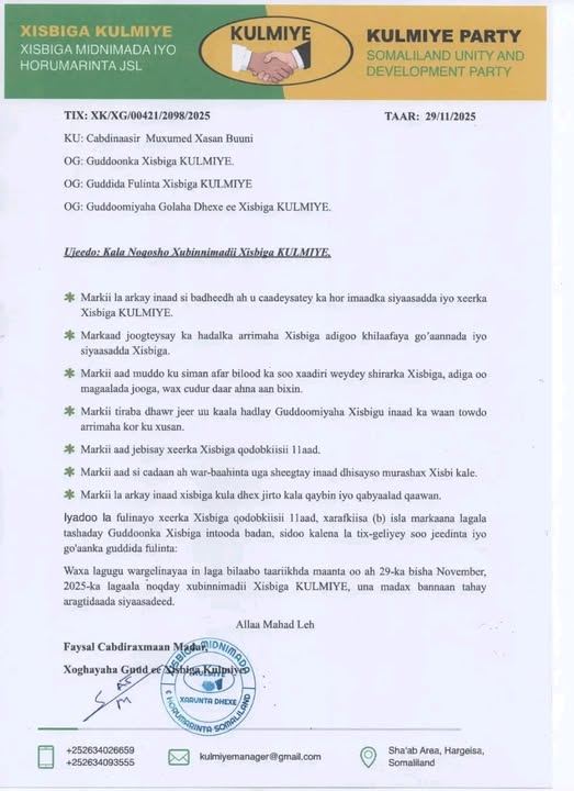Xisbiga Kulmie oo go’aan ka soo saaray Afhayeenkii hore ee xisbiga, Cabdinaasir Muxumed Xasan Buuni.