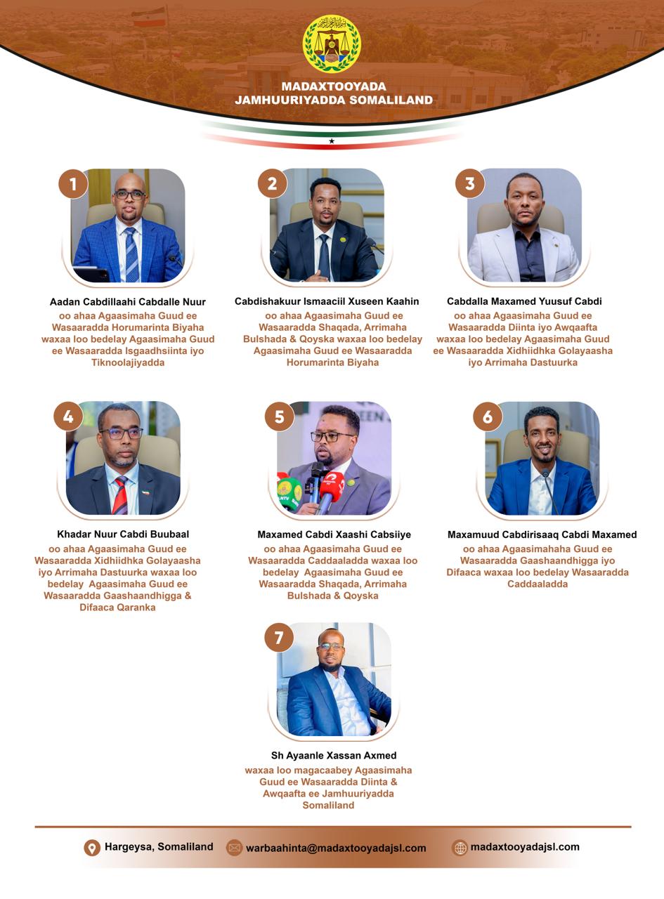 ๐. Mudane Maxamed Cabdi Xaashi Cabsiiye oo ahaa Agaasimaha Guud ee Wasaaradda Caddaaladda aan u beddelo Agaasimaha Guud ee Wasaaradda Shaqada, Arrimaha Bulshada & Qoyska ee Jamhuuriyadda Somaliland.